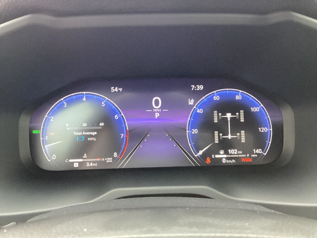 - 12.3-in. digital gauge cluster with customizable settings, odometer, tripmeters, clock, outside temperature, rear passenger seatbelt indicators, fuel gauge, hybrid energy monitor, battery charge meter, fuel economy information, trip timer, shift-position and scheduled maintenance indicators, and warning messages